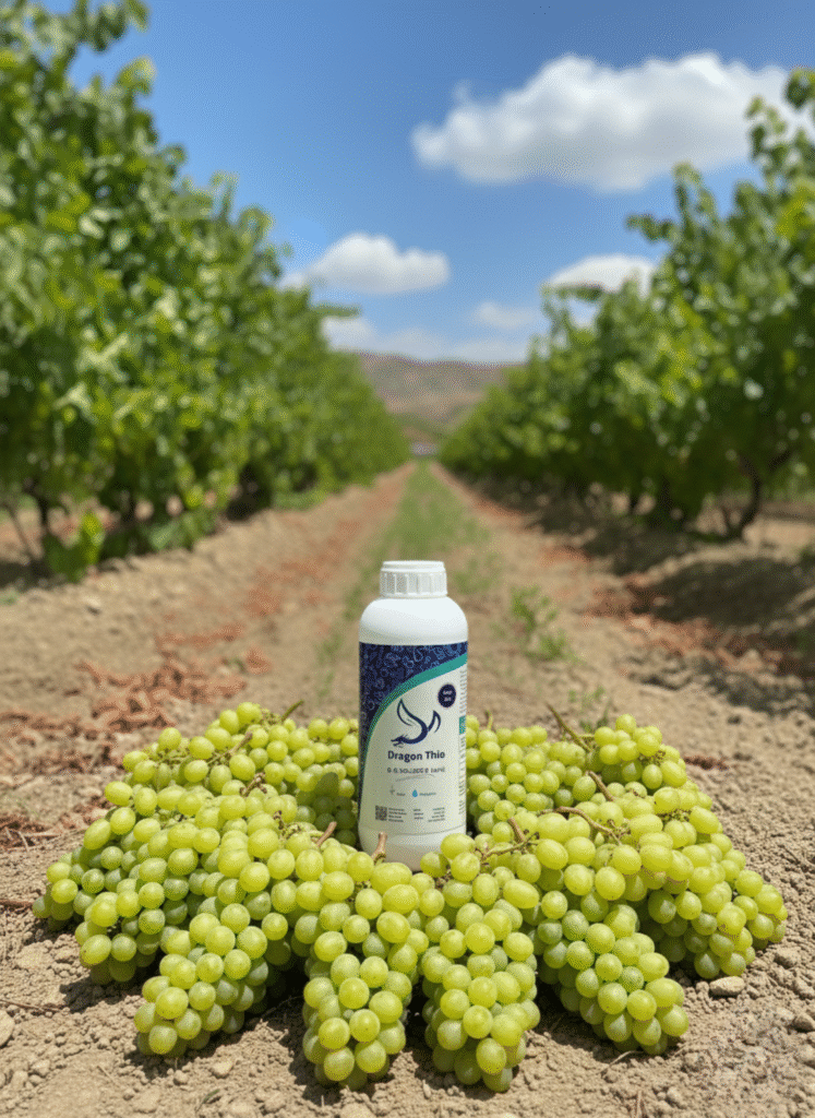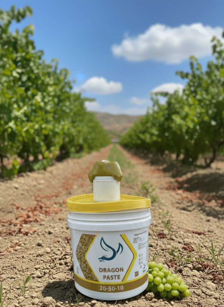 Las plantas de uva tratadas con Dragon Paste 10-50-20 + Dragon Thio mostraron un crecimiento más fuerte, un follaje más verde y racimos más uniformes.